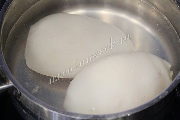 Опустим тушки кальмара в кипящую подсоленную воду ровно на 3 минуты, достанем и оставим остужаться.