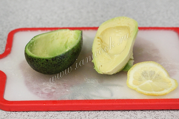 Ложкой достанем мякоть, нарежем ее и сбрызнем соком лимона. Авокадо должен быть спелым и чуть мягким.
