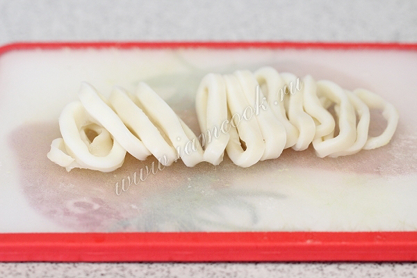 Остывшие кальмары очистим от пленки и нарежем. Нарезка может быть произвольной.