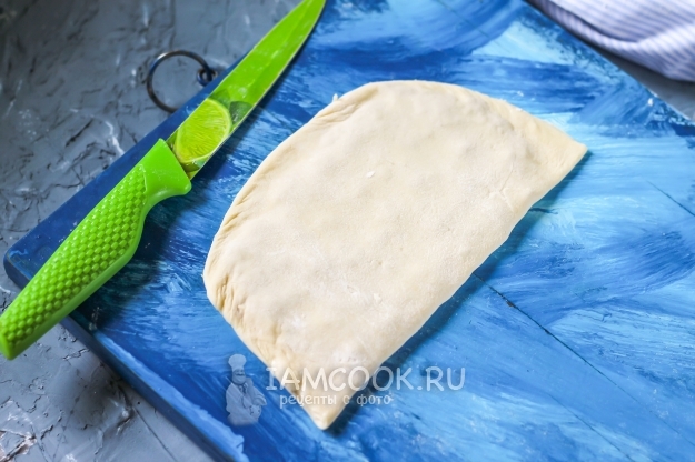 Накройте начинку вторым краем теста, выпустите воздух, чтобы выпечка не вздулась на сковороде, защипните и отрежьте лишние края.