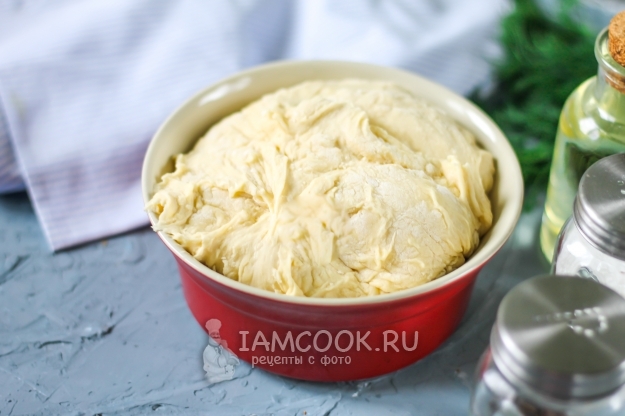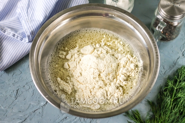Всыпьте пшеничную муку и замесите тугое пластичное тесто.