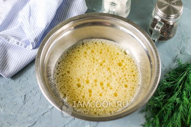 Вбейте в емкость куриное яйцо, влейте воду, всыпьте 3 щепотки соли и взбейте все венчиком или вилкой.