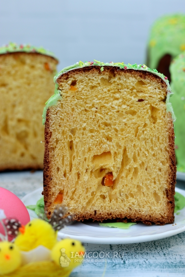 Покрыть куличи глазурью, мне в этот раз захотелось салатового цвета, по-весеннему! И сразу показываю вам разрез куличей на следующий день. Свежий кулич «Кружевная баба» очень нежный, разрезать его невозможно, только разламывать.