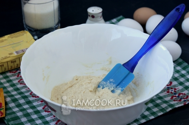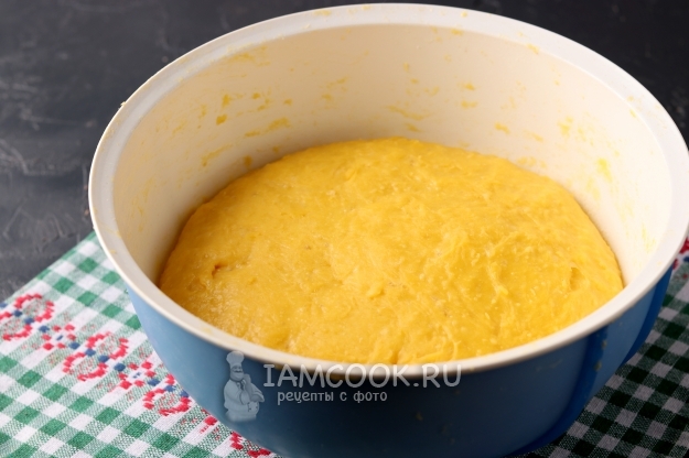 Из оставшейся муки, опары и взбитых желтков замесить однородное тесто. Тесто будет слегка липким из-за удвоенной нормы сахара, но если делать строго по рецепту, то этого не произойдёт.