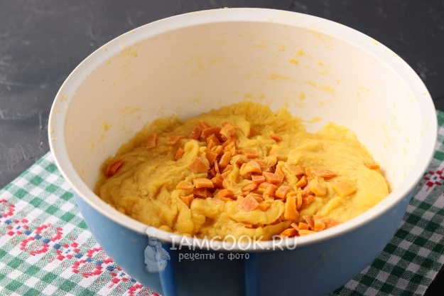 Подошедшее тесто обмять, при желании вмешать сухофрукты. У меня нашлось около 50 г манговых цукатов, решила их использовать в эти куличи.