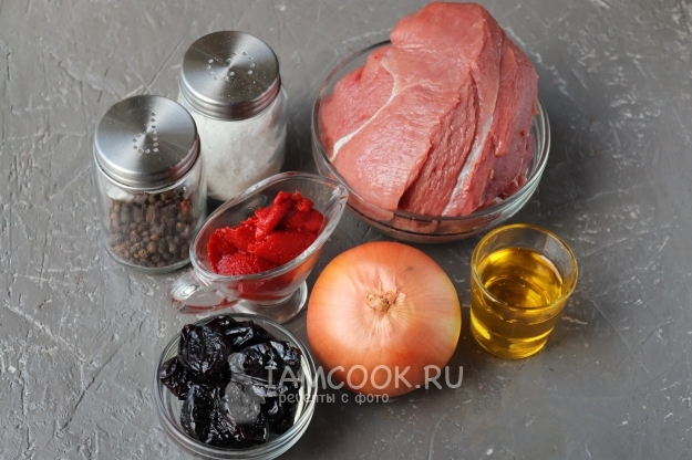 Продукты для приготовления тушеной говядины с черносливом в казане подготовим по списку ингредиентов к рецепту.