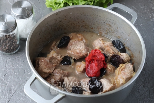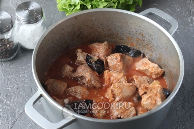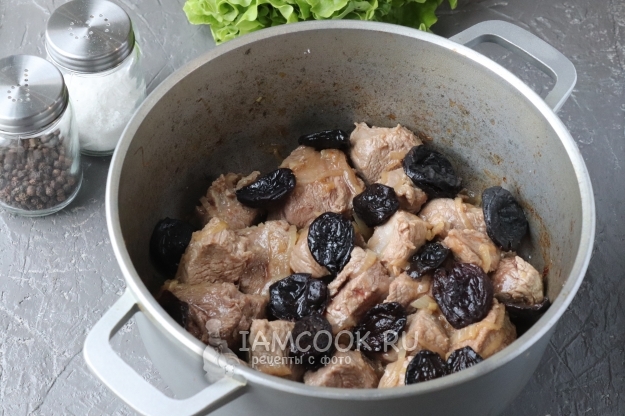 Под воздействием высокой температуры мясо выделит много сока, подождём пока он весь выпарится и отправим в казан чернослив. Обжарим всё вместе пару минут.