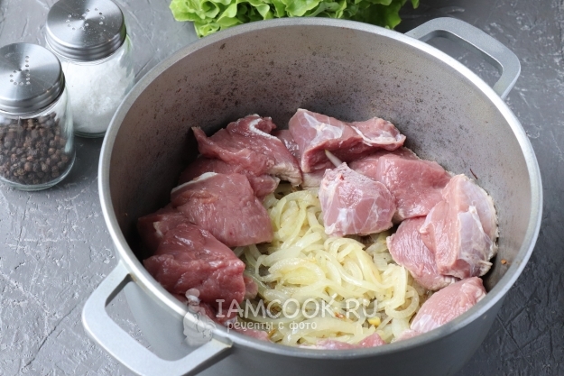 Тем временем займёмся мясом. Подходящий кусок говяжьей мякоти промоем под холодной проточной водой, обсушим и нарежем порционными кусочками, желательно одинакового размера. Затем отправим их к луку и перемешаем.