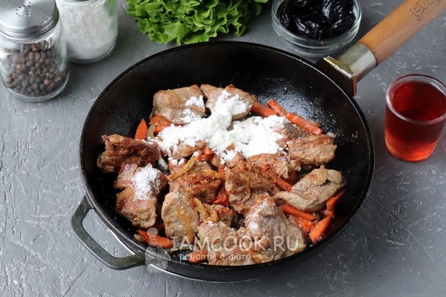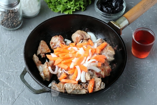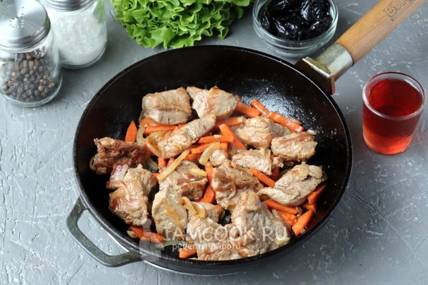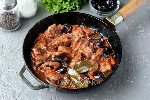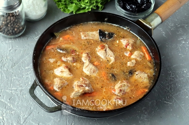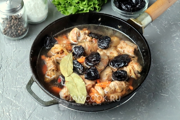 Затем выложим чернослив с лавровым листом. Содержимое сковороды зальём вином и мясным бульоном (водой).
