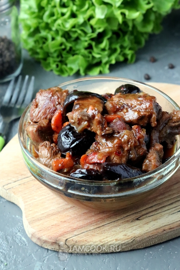 Вот и всё, вкуснейшая тушеная говядина с черносливом с вином готова. На стол подаём в горячем виде.