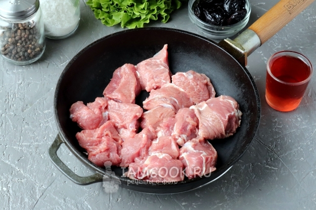 Мясо тщательно помоем под проточной водой, обсушим бумажным полотенцем, а затем нарежем средними кусочками одинакового размера. Выложим их на разогретую с растительным маслом сковороду и обжарим в течение 5 минут на сильном огне, периодически помешивая для равномерной прожарки.