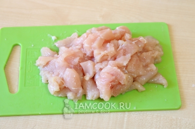 Куриное филе промываем и также мелко рубим ножом. Можно использовать готовый куриный фарш.