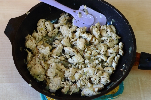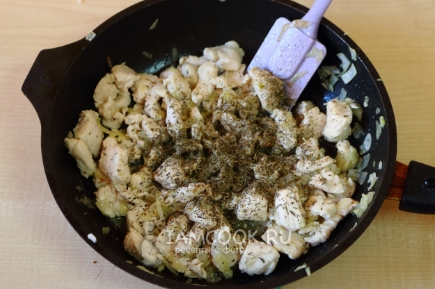 Выкладываем лук с курицей на сковороду с растительным маслом и жарим 5 минут. После чего всыпаем специи по вкусу: соль, перец, тимьян и базилик.