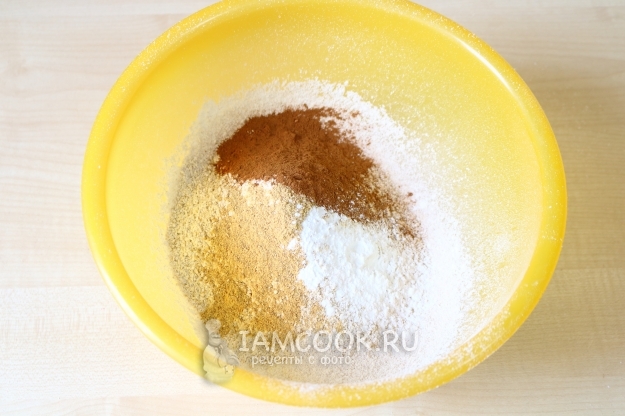 В миску просеиваем пшеничную муку, всыпаем овсяную (если мелкая, можно просеять). Добавляем молотый имбирь, корицу и разрыхлитель.