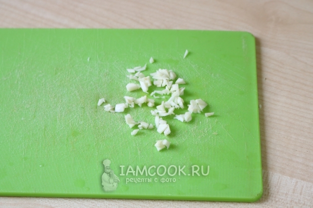 Чеснок мелко рубим ножом, можно воспользоваться прессом для чеснока.