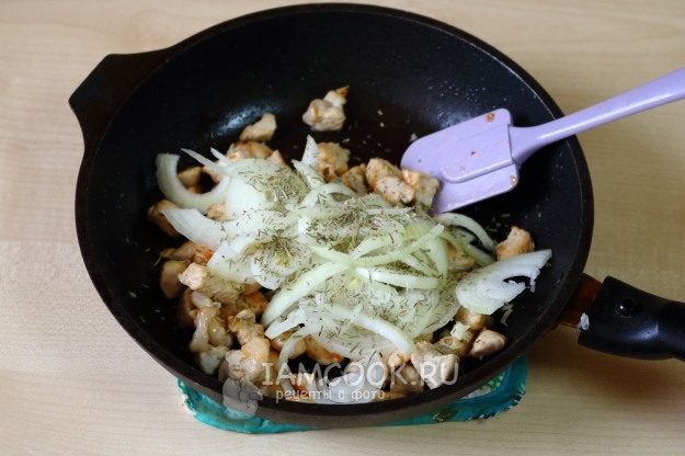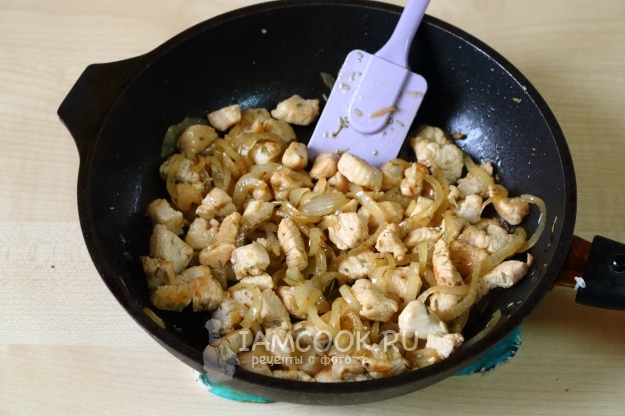 Мясо обжариваем на разогретой с растительным маслом сковороде до золотистости. Выкладываем лук с чесноком, всыпаем соль по вкусу, а также розмарин.