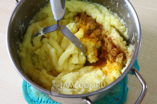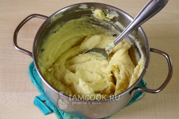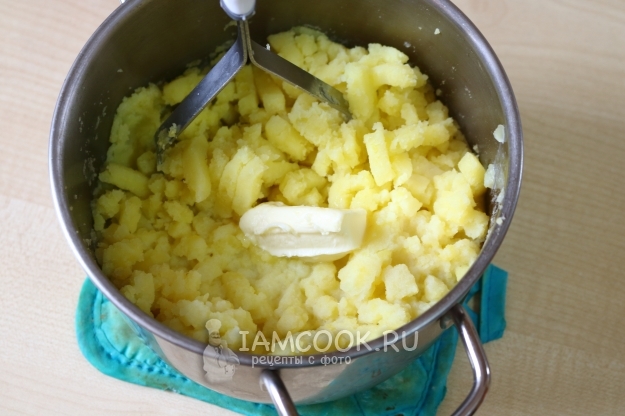 Тем временем картофель уже сварился. Сливаем воду и разминаем картошку толкушкой до однородности. Добавляем сливочное масло и горячее молоко.