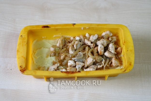 Формируем запеканку. На дно формы выкладываем слой картофельного пюре, половину всей массы. Поверх следует слой мясной начинки.