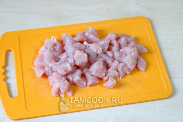 Филе индейки промываем и режем ножом на мелкие кусочки.