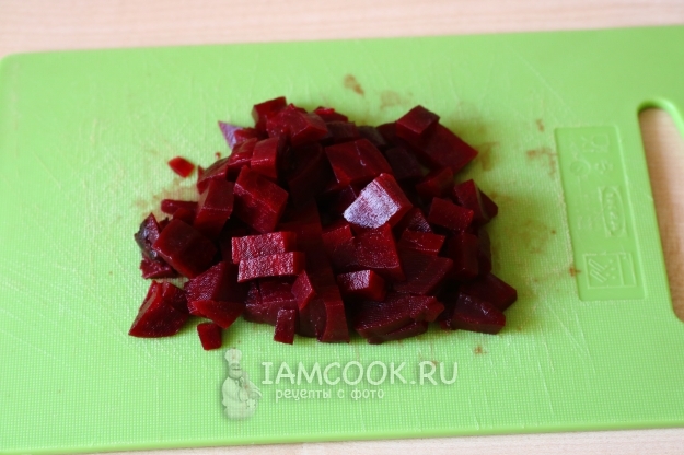 Отваренную и очищенную свёклу нарезаем мелким кубиком.