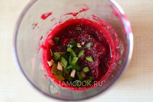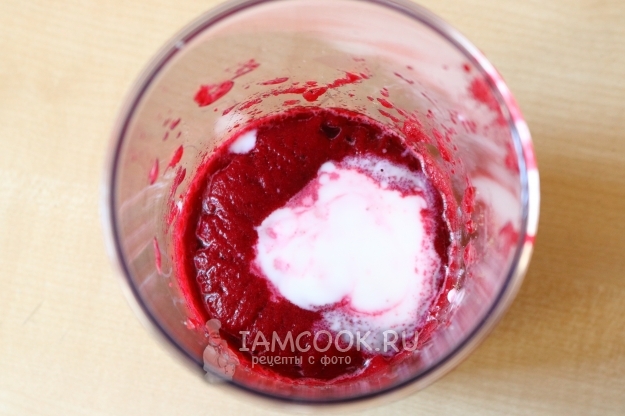 Пробиваем погружным блендером вместе со свекольным соком до однородности.