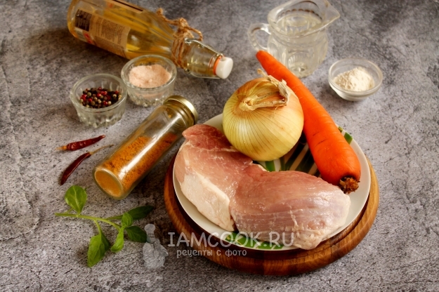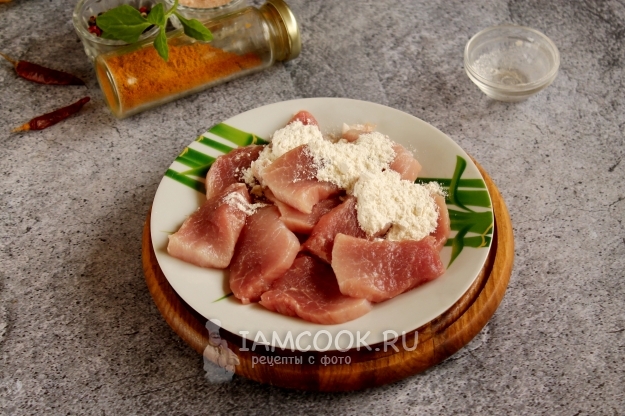 Чистую свиную мякоть делим кусками примерно одинакового размера, обсыпаем мукой для легкого загустения соуса.