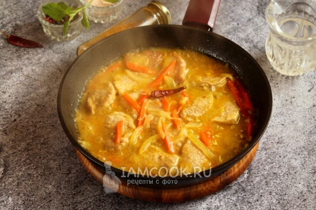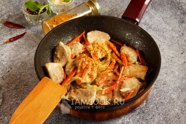 Приправляем свинину с овощами карри, солью или соевым соусом.