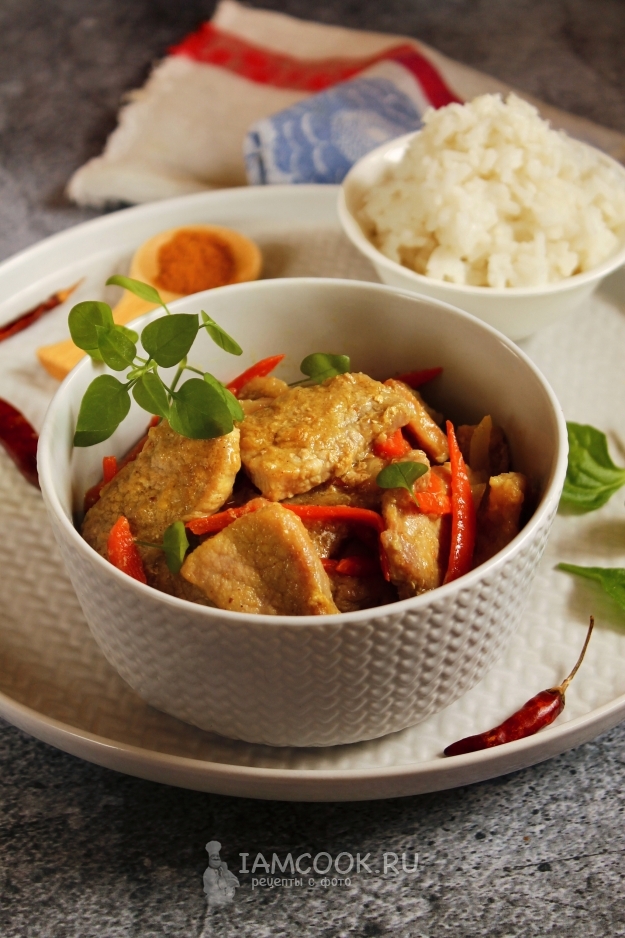 Подаем ароматную свинину карри со свежей зеленью и, например, рисом.