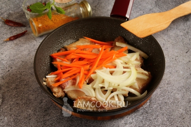 Добавляем овощи: репчатый лук и морковь (нашинкованные тонкой соломкой). Перемешиваем, обжариваем несколько минут - до размягчения овощной смеси.