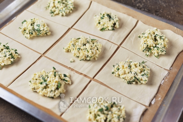 Отрежьте кусок бумаги для выпечки, при необходимости посыпьте ее мукой, раскатайте тесто. С помощью ножа для пиццы нарежьте тесто на 9 равных квадратов. В центр каждого выложите по столовой ложке творожной начинки с зеленью.