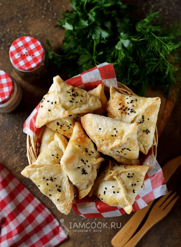 Взбейте вилкой оставшийся белок куриного яйца, смажьте им каждый пирожок, посыпьте кунжутом. Выпекайте конвертики при 180 градусах минут 15-20 в режиме верхнего и нижнего нагрева.