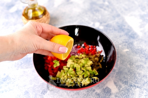 Авокадо очистите от кожуры и косточки, нарежьте вместе с болгарским перцем мелким кубиком, положите в миску. Полейте овощи лимонным соком.