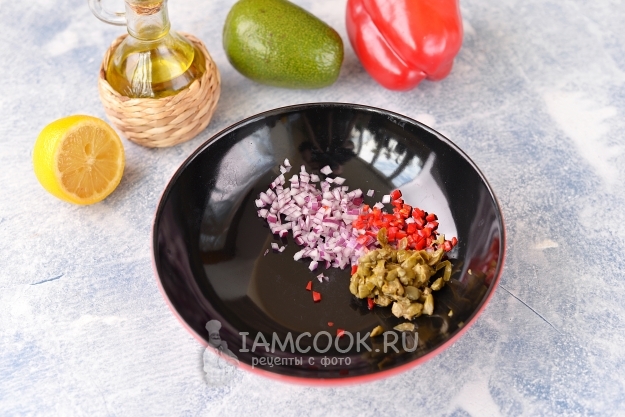 Красный лук очень мелко порубите ножом, добавьте нарубленные каперсы. Острый перец очистите от семечек и белых перепонок, также мелко нарежьте. Сложите ингредиенты в глубокую миску.