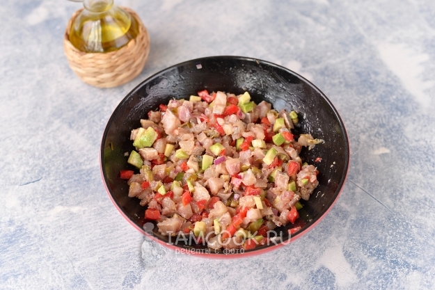 Заправьте тартар маслом, поперчите, перемешайте. Попробуйте на вкус - возможно, нужно будет добавить немного соли.