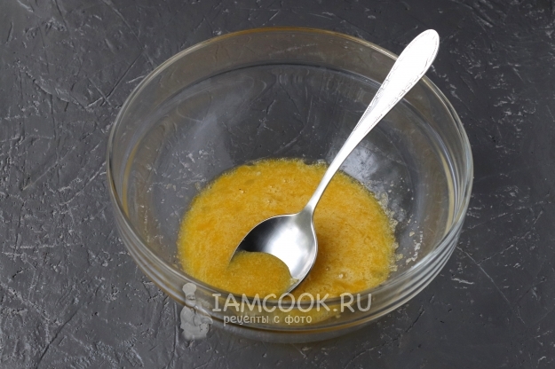 В подходящей ёмкости соединить куриное яйцо с сахарным песком. Тщательно перемешать до однородной массы.