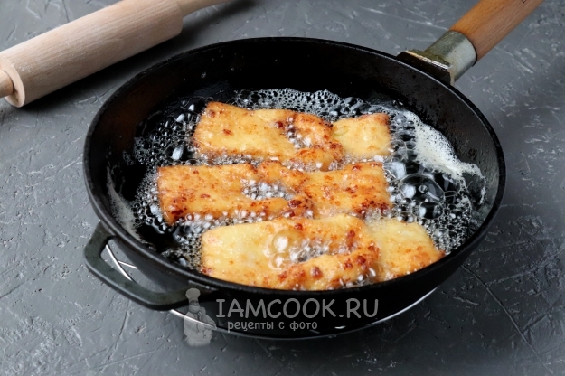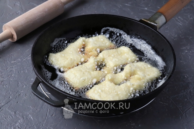 В сковороде или небольшом сотейнике разогреть достаточное количество растительного масла. Выложить хворост и обжарить на небольшом огне до золотистого цвета, по 3-4 минуты с каждой стороны.