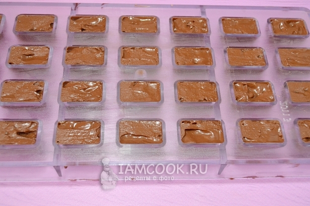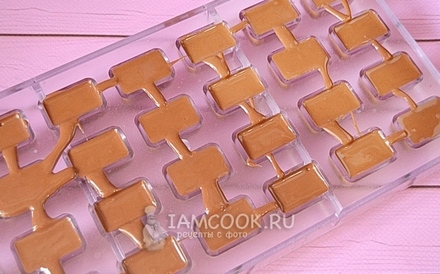 Сделаем в мешке надрез и наполним ячейки формы полностью. Если массы не будет хватать, то распределим шоколад так, чтобы растянуть на все ячейки, промазывая бока и дно. Постучим формой, чтобы шоколад распределился по ячейкам и вытеснил пузырьки воздуха.