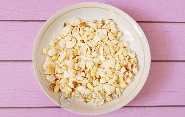 Если вы используете цельный фундук, то сначала поджарьте его, снимите с него шкурку, а затем раздробите кулинарным молоточком.