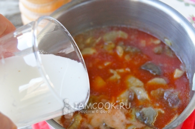Разведите крахмал в небольшом количестве воды и влейте в грибы, посолите и, помешивая, доведите до загустения.