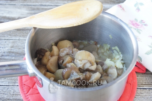 Выложите грибы и обжарьте, помешивая, около 10-15 минут на среднем огне.
