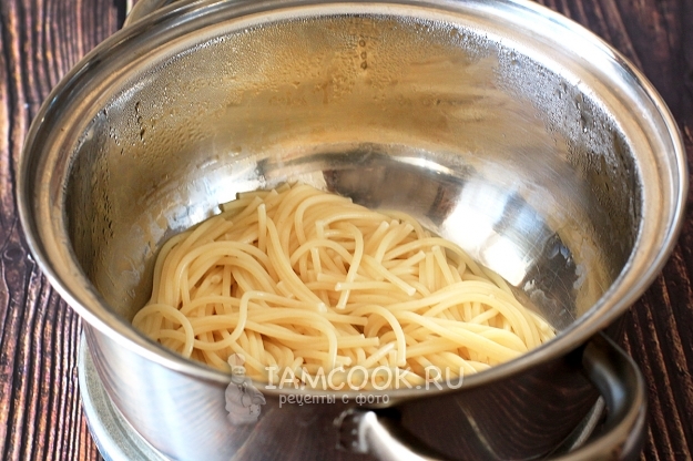 Спагетти отварите в подсоленной воде, как написано на упаковке. Варите их на минуту меньше указанного срока, так как они еще дойдут в сковороде. Слейте с них воду и оставьте под крышкой.
