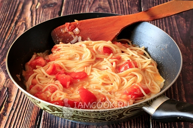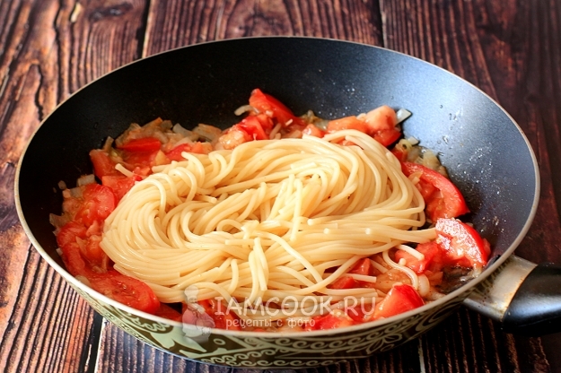 Добавьте в сковороду отваренные спагетти и перемешайте.