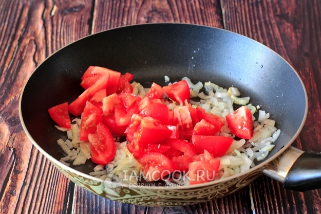 К обжаренному луку добавьте помидоры, нарезанные мелкими кусочками. Обжаривайте все вместе, пока помидоры не станут мягкими. Я люблю солить на этом этапе.