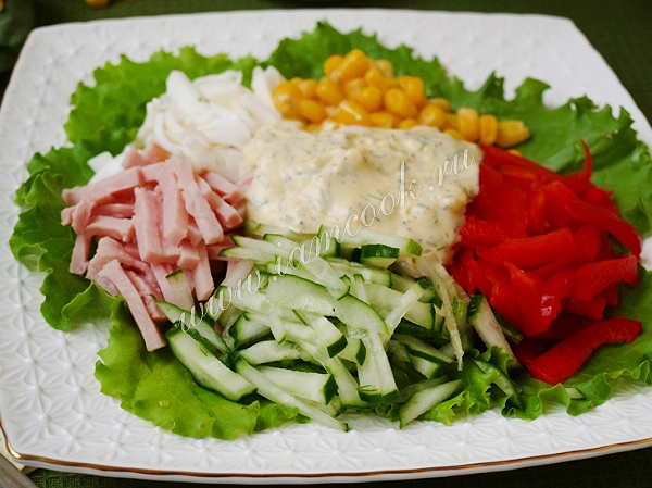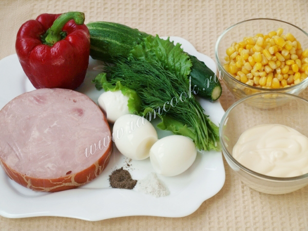 Для салата нам понадобятся: болгарский перец красного цвета, ветчина, свежий огурец, консервированная кукуруза, варёные яйца, зелень, салатные листья, майонез, чёрный перец и соль.