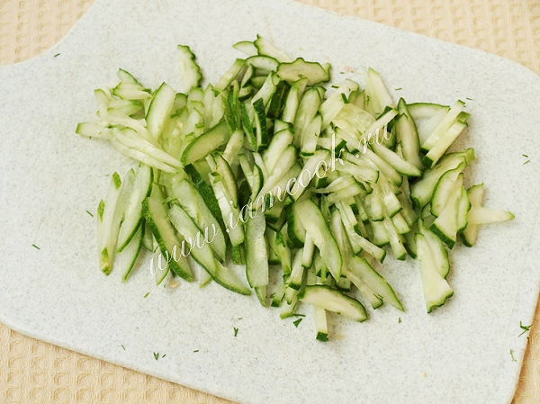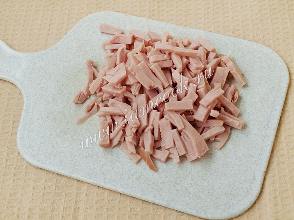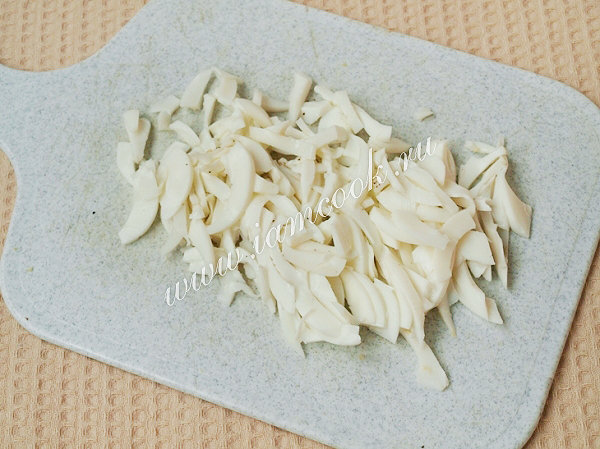 Варёные яйца разделить на белки и желтки. Белки также нарезать соломкой.