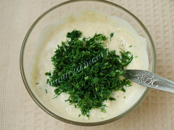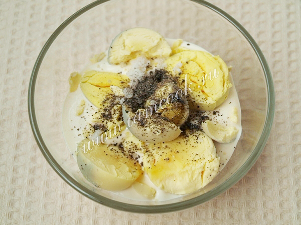 Желтки добавить к майонезу и хорошо размешать. Посолить и поперчить.