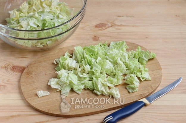 Половину кочана пекинской капусты нарежем квадратиками, а не соломкой, так она лучше будет смотреться в салате. Совсем твердые части листьев у основания я не использовала. Сложим нарезку в салатник.