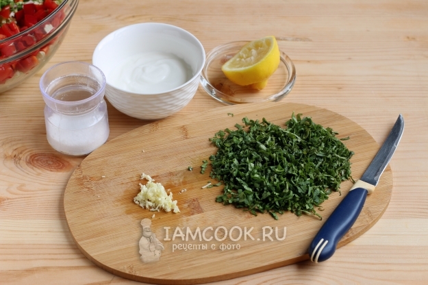 Теперь сделаем соус-заправку на основе йогурта. Нарежем мелко кинзу, чеснок, потом смешаем их с йогуртом, добавим лимонный сок и соль по вкусу.
