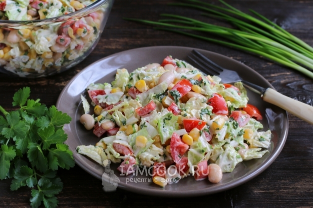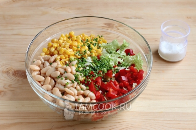 В салатник к овощам всыпаем фасоль, кукурузу и нарезанные мелко перья зеленого лука, подсаливаем слегка по вкусу.