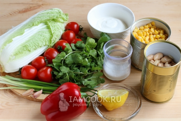 Для приготовления овощного салата с фасолью и йогуртовым соусом возьмем все необходимые продукты, перечисленные в списке, зелень и овощи хорошо помоем под проточной водой, банки с кукурузой и фасолью вскроем и сольем жидкость.